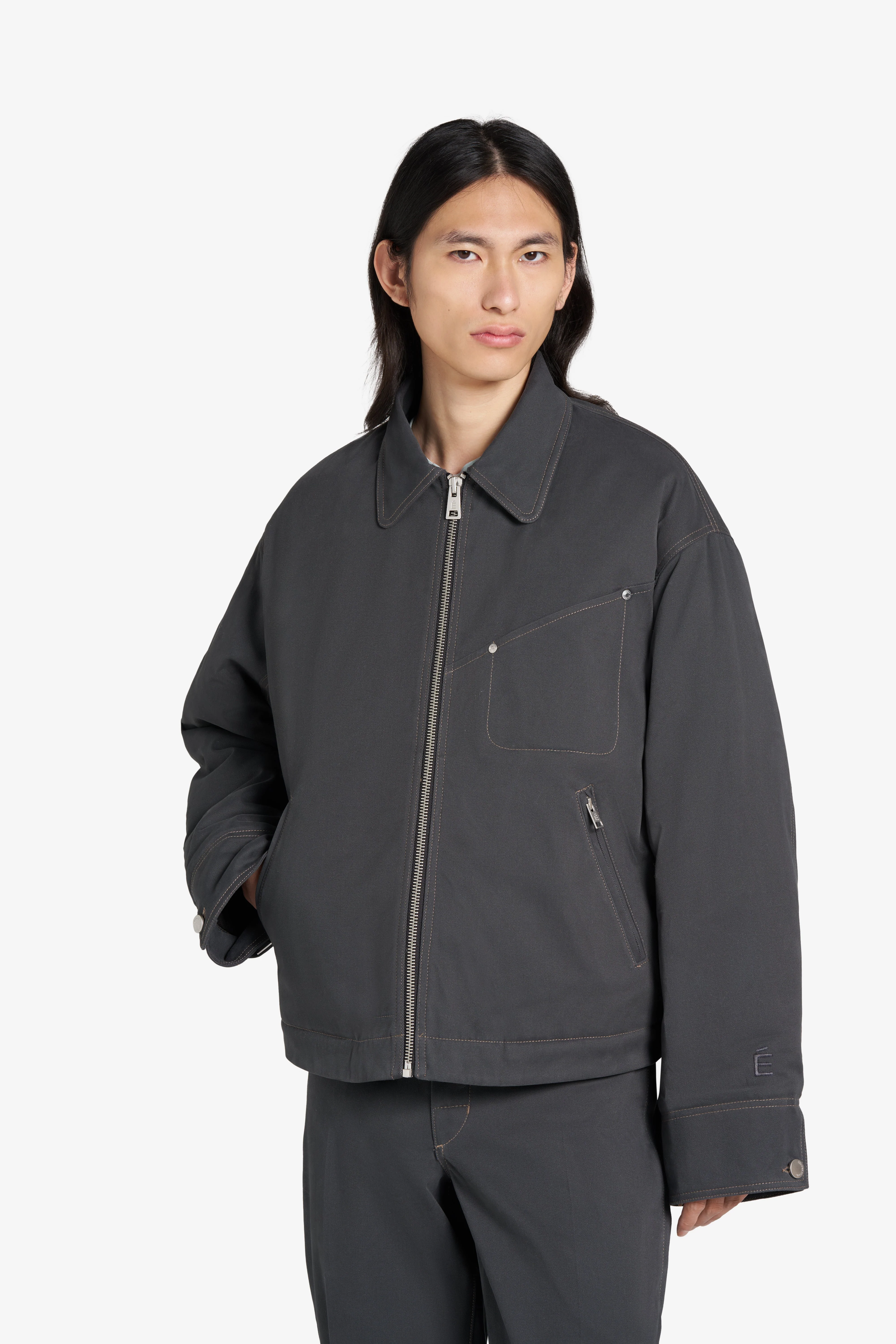 This jacket is a 100% cotton with contrast stitches with a classic zipper. It has four pockets: two zipped main pockets, one chest pocket, and one interior patch pocket. The Études Studio rivets on the side of the chest pocket and adjustment buttons at back hem add a touch of personality. The bottom of the left sleeve is decorated with an É embroidery.