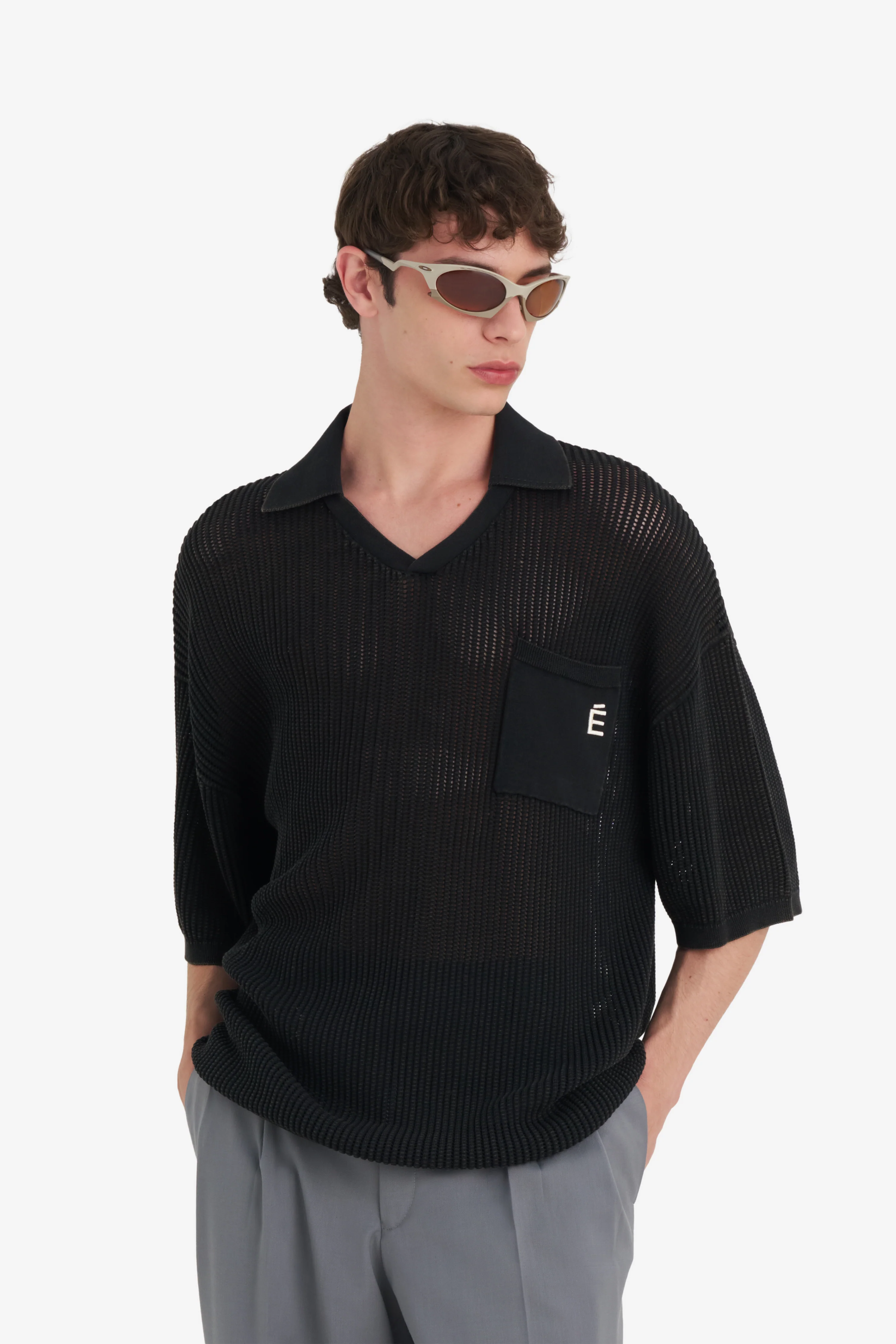 The Knit Polo Wash is a short sleeve knitted lace polo t-shirt made in 100% cotton. With a V-neck collar, it also comes with an É embroidered patch on chest pocket.